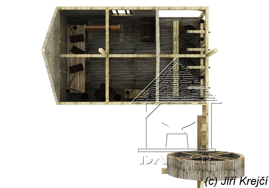 Podobně jako hrnčířská dílna je i koncepce papírny rozdělena na vnější a vnitřní prostor dle středověké technologie výroby papíru. Vnější prostor je vybaven papírenskou stoupou, která je poháněna velkým mechanickým šlapacím kolem, které nahrazuje kolo vodní. Vnitřní prostory obsahují dvě čerpací kádě, lisy, prostory pro sušení a další nářadí a vybavení středověké papírnické dílny. Součástí je rovněž plánovaná expozice vzniku a výroby pergamenu.